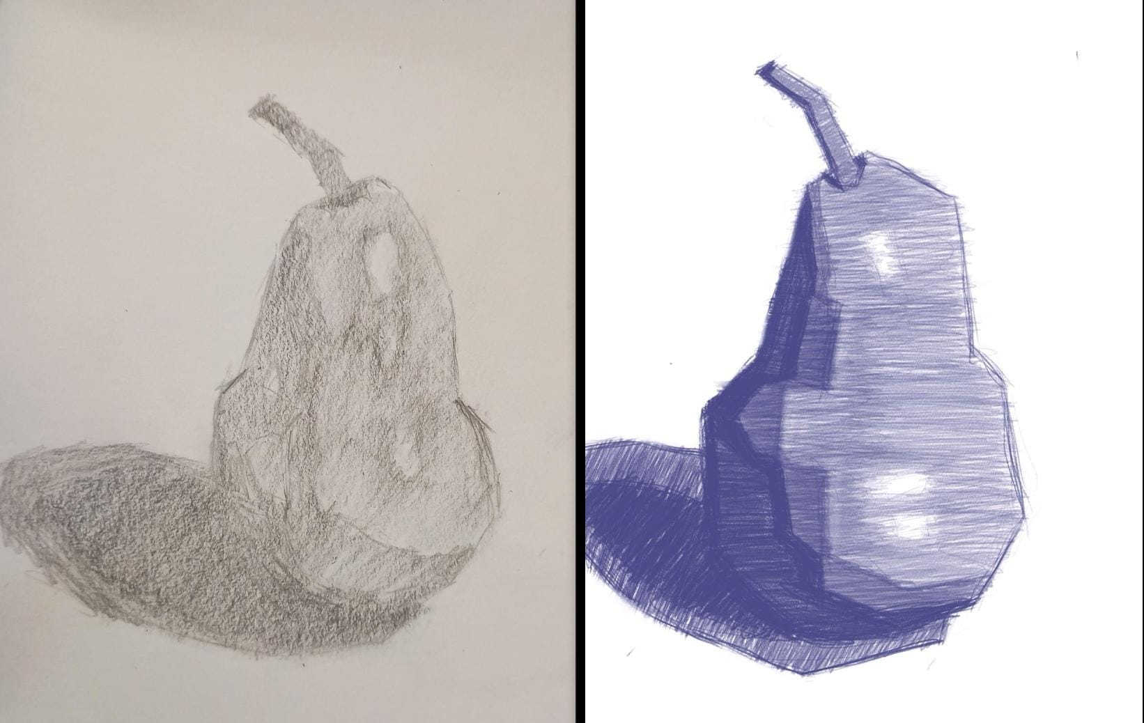 I started the Proko Drawing Basics course, and my 'before' and 'after' the demo attempts at the simplified pear form in lesson 1 turned out like this: